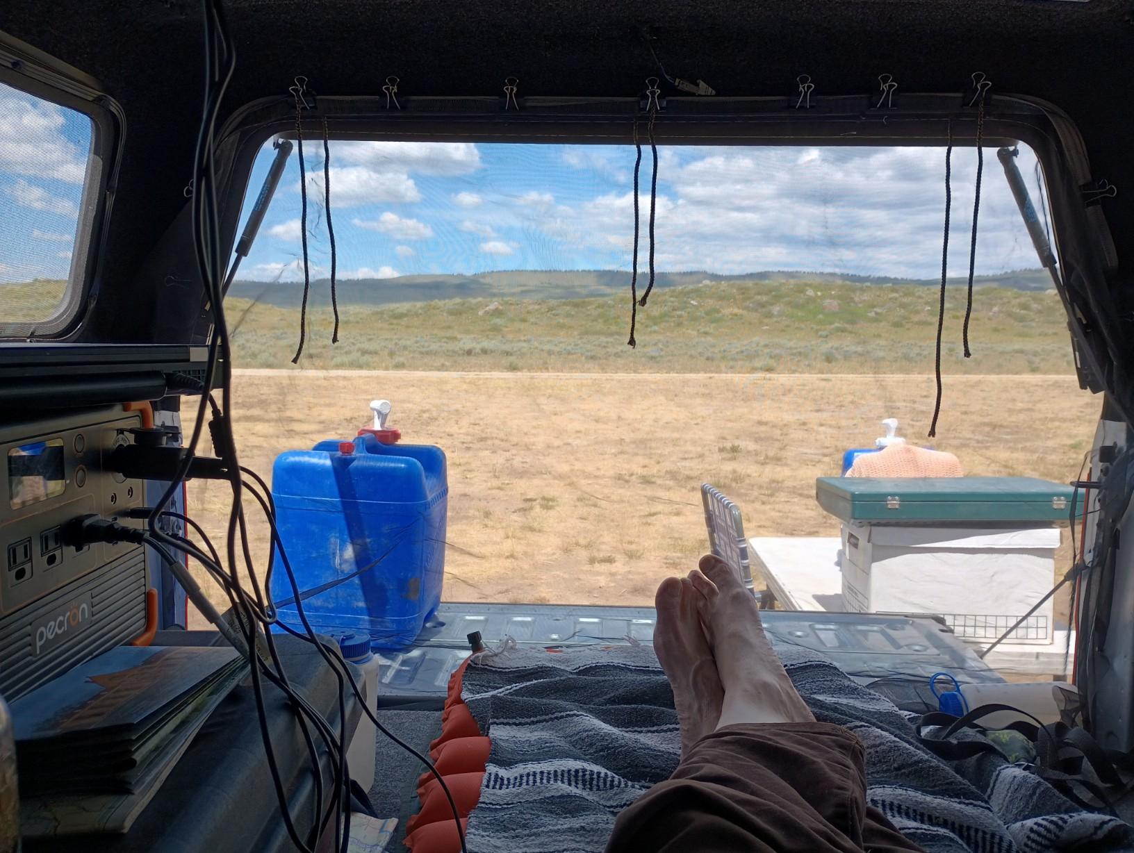 I'm taking the day off and hanging out--out of the sun--in my truck shell. It's quite comfortable. It's ~28°C (82°F) outside. I have the side windows open and the mosquito net down in back. I have two small 5vdc fans hanging from Velcro from the roof but only one is running right now. I'm drinking coffee, like any good desert rat does on a warm or hot day. It's starting to feel like nap time...