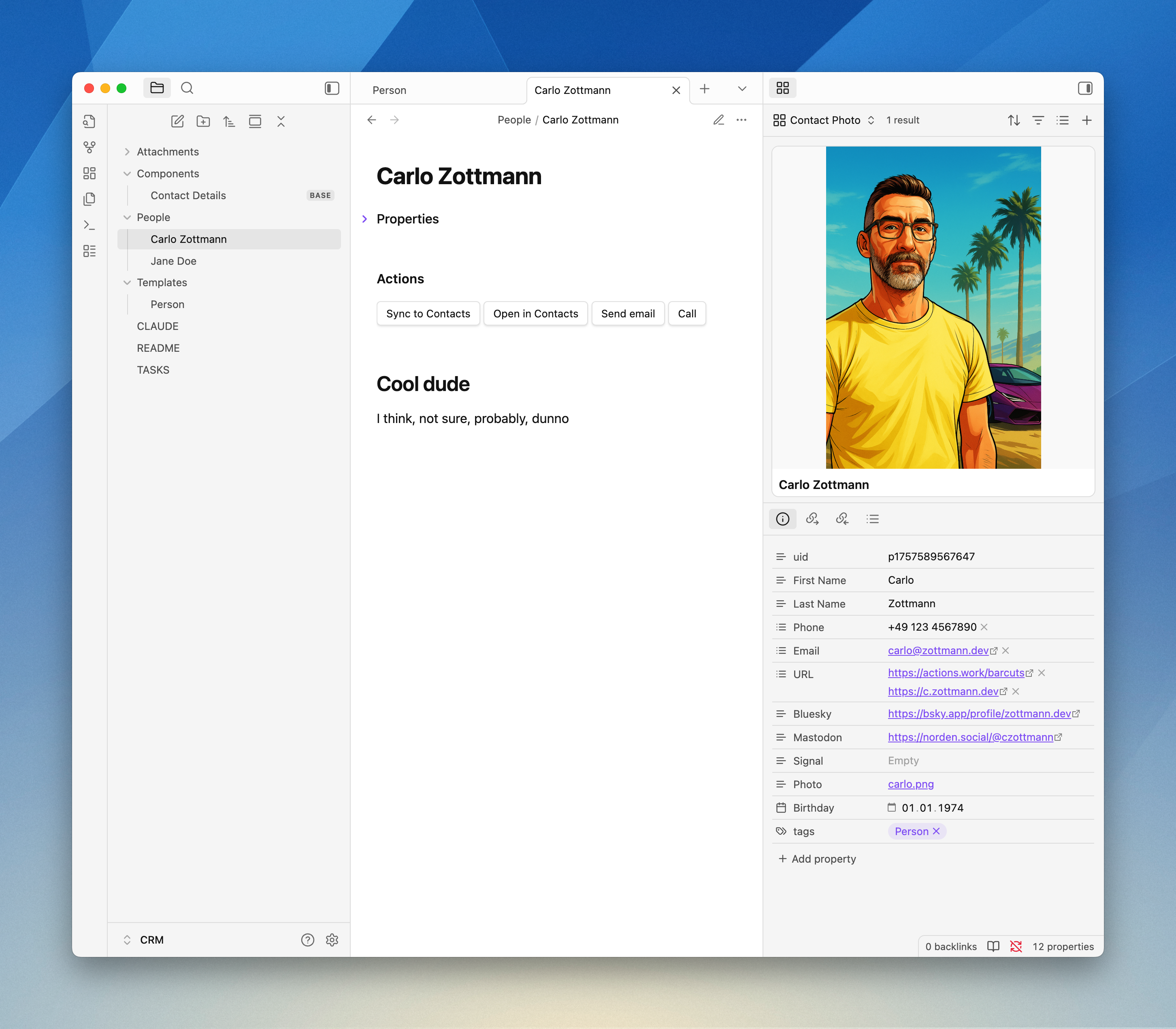 My #Obsidian + Contacts + #Shortcuts mini #CRM is making good progress. This is fun. I had hoped that I would be able to only use core plugins for it, but Bases alone doesn't cut it – no way to get the vault name inside a Bases document, it seems, which is vital for what I'm trying to do. So… Bases + Dataview, then.